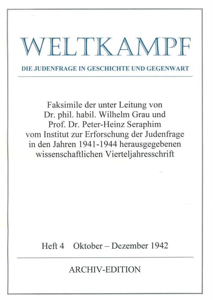 Faksimile der unter Leitung von Dr. Phil. habil. Wilhelm Grau und Prof. Dr. Peter-Heinz Seraphim vom Institut zur Erforschung der Judenfrage in den Jahren 1941- 1944 herausgegebenen wissenschaftlichen Vierteljahresschrift. Inhalt: Aufsätze, Goethe-Forschung, Kultur, Kleine Beiträge, Berichte, Buchbesprechungen, politisches Tagebuch vom 01.06. bis 31.08.1942, Neue Bücher und Aufsätze. Faksimile-Ausgabe 1998, Verlag für ganzheitliche Forschung, Viöl /Nordfriesland, Atlas Großformat, Broschur gebunden, 255 bis 326 Seiten, Zustand: I-II