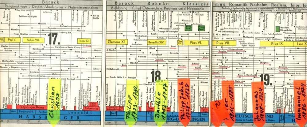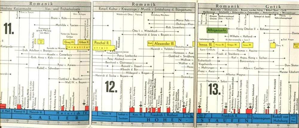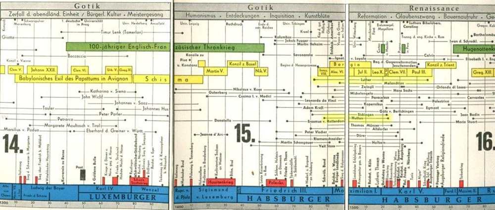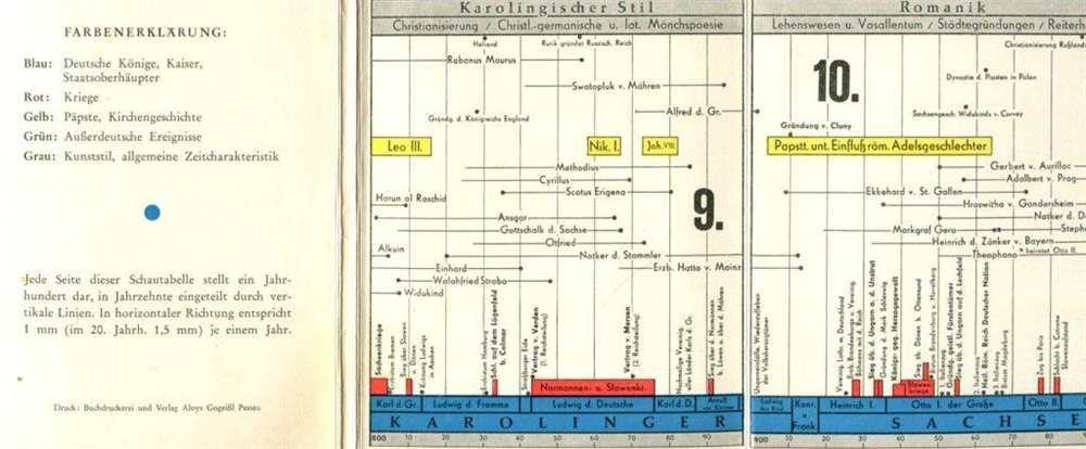 Die farbige Synchron-Schautabelle in Taschenformat zum Gebrauch für Lehrer, Schüler, Studenten und alle historisch und literarisch Interessierten. Hier werden alle wichtigen Einzelheiten der Geschichte von 800 bis zur Gegenwart sowie ihre Stellung im historischen Gesamtprozess gezeigt. Es wird auf einem Blick das Kulturkolorit der geschichtlichen Epochen vermittelt. Es gibt schnelle und gründliche Auskunft beim Besuch von Theatern, Kunstausstellungen, Museen und historischen Stätten. 3. Auflage, ohne Jahresangabe um 1960, Eigenverlag, Griesbach/Passau, Kleinformat, Broschur/Karton gebunden, klappbare farbige Seiten, beschriebene Fähnchen abnehmbar, Zustand: II-III