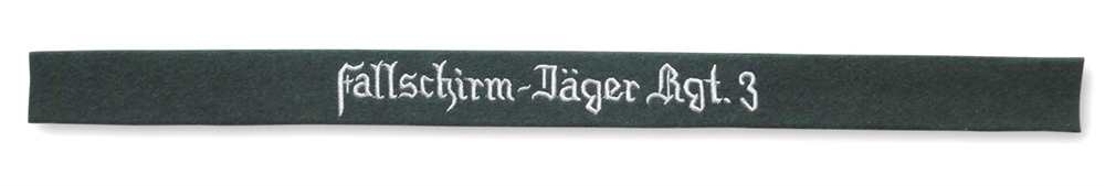 Schöne, hochqualitative Sammleranfertigung. Ärmelband "Fallschirm-Jäger Rgt. 3". Länge: ca. 49 cm, Breite: ca. 3,6 cm, Farbe: Grün, silbergrau gestickter Schriftzug.