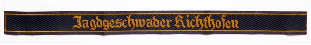 Schöne, hochqualitative Sammleranfertigung. Ärmelband "Jagdgeschwader Richthofen". Länge: ca. 42,5 cm, Breite: ca. 3,4 cm, Farbe: Schwarz, goldgelber Schriftzug, gewebt, BEVO-WUPPERTAL