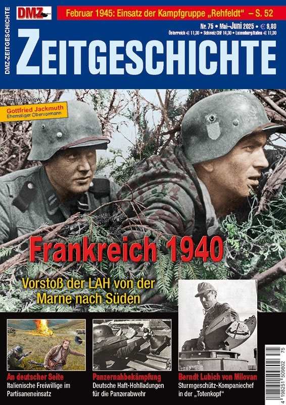 Die 75. Ausgabe hat u.a. folgende Themen zum Inhalt: Februar 1945: Einsatz der Kampfgruppe "Rehfeldt", Frankreich 1940: Vorstoß der LAH von der Marne nach Süden, Im Interview: Gottfried Jackmuth - Ehemaliger Obervormann, An deutscher Seite: Italienische Freiwillige im Partisaneneinsatz, Panzernahbekämpfung: Deutsche Haft-Hohlladungen für die Panzerabwehr, Berndt Lubich von Milovan: Sturmgeschütz-Kompaniechef in der "Totenkopf", Soldatenporträt: An der Spitze seine Männer - SS-Obersturmführer Friedrich Holzer, Truppengeschichte: III. germanisches SS-Panzer-Korps, dazu gibt es Fotodokumente, Kalenderblätter und Buchrezensionen, u.v.m.