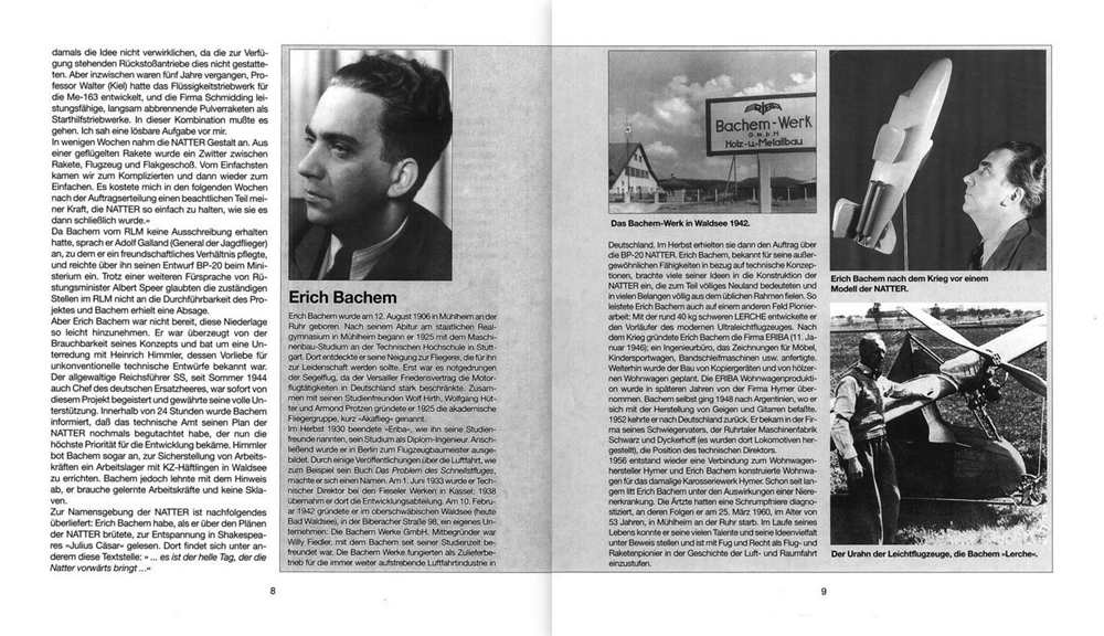 Am 1. März 1945 startete bei Stetten a.k.M. die erste bemannte Rakete der Welt: die revolutionäre Bachem Ba-349 »Natter«. Sie verwendete erstmals »Booster«-Raketen als Starthilfe, ließ sich über manuell bedienbare Strahlruder lenken und verfügte über ein leitstrahlgesteuertes System zum Heranführen an die Bomberverbände. Auch zur Bewaffnung gehörten Raketen, die aus dem Rumpfbug verschossen wurden.
