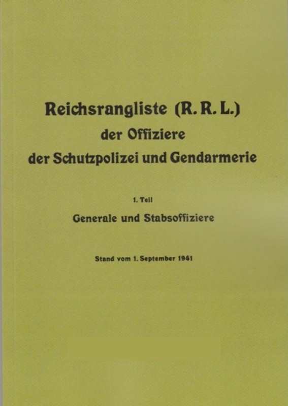 Der Band ist gegliedert in "Generale der Polizei", "Oberste der Schutzpolizei und Gendarmerie", "Oberstleutnante der Schutzpolizei und Gendarmerie" und "Majore der Schutzpolizei und Gendarmerie". Es werden insgesamt 953 Personen tabellarisch mit Geburtsdatum, Familienstand/Kinder, letzte Beförderung, NSDAP-Eintrittsdatum und Mitgliedsnummer sowie SS-Nummer verzeichnet. Originalgetreuer Reprint des im Original äußerst seltenen und gesuchten (zu Spitzenpreisen gehandelt) Werkes von 1941. 159 Seiten, Broschur
