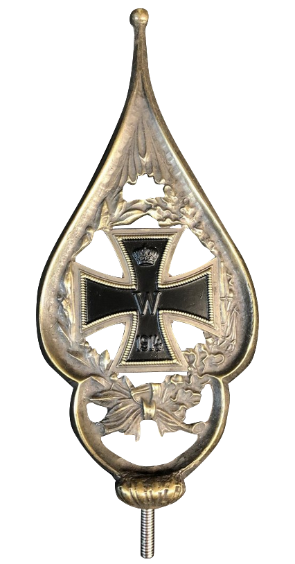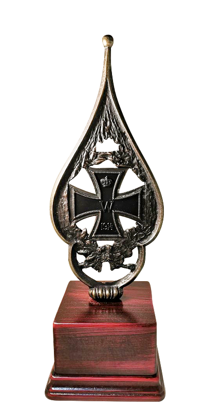 Sammleranfertigung - Hochwertige Fahnenspitze für die Fahnen der Regimenter. Die Fahnenspitze hat ein Schraubgewinde zum befestigen auf einer Fahnenstange oder einen Sockel, selbiger verfügt ebenso über ein Schraubgewinde zum einschrauben der Fahnenspitze. Der schöne Sockel im Mahagoni-Stil hat zusätzlich noch eine Samtunterlage. Material: Gußeisen / Holz, Maße der Fahnenspitze: ca. 20 cm x 9 cm, Maße des Sockels: ca. 9 cm x 9 cm x 6 cm, Gesamthöhe: ca. 26 cm