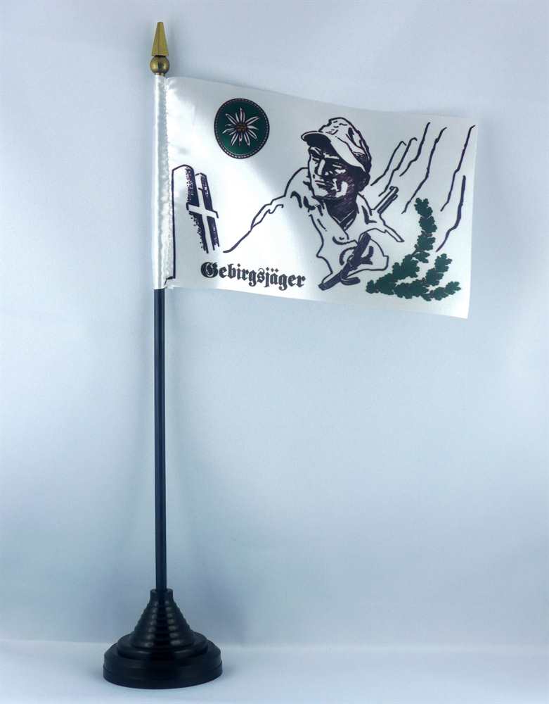 Diese Fahne ist in einem neuen Digital Sublimationsdruck hergestellt worden. Feinste Linien und Details werden abgebildet. Die Farben sind voll durchgedruckt und erscheinen auf der Rückseite spiegelbildlich. Seidig glänzendes wetterfestes Polyester. Die Ränder der Fahne werden mit einem Laser geschnitten und können dadurch nicht ausfransen. Die obere Spitze ist mit Mattgold bemalt. Format: 10 x 15 cm, Höhe: ca. 28 cm