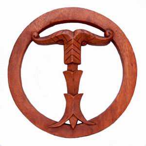 Handgeschnitzte Irminsul, die Weltensäule aus Soar Holz. Das Lebenssymbol sehen wir besonders gut im Frühling in der Natur, wenn die jungen Pflanzen wie Widderhörner aussehen. Ein Symbol des Lebens und der auferstehenden Kräfte der Erde. Die hier abgebildeten Schnitzereien sind aus Soar-Holz. Unterschiede in Farbe und Form und Ausdruck sind daher natürlich. Durchmesser 33 cm