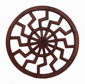 Handgeschnitzte Schwarze Sonne. Die hier abgebildeten Schnitzereien sind aus Soar-Holz. Unterschiede in Farbe und Form und Ausdruck sind daher natürlich. Durchmesser 22 cm