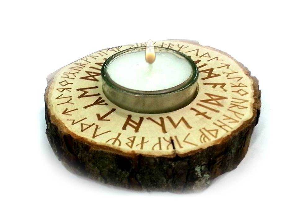 Runenspruch: "Odin schütze dieses Heim" mit Futhark. Rindenscheibe aus natürlichem Erlenholz, unbehandelt. Beidseitig geschliffen, mit Lasergravur. Jedes Teil ein Unikat. Durchmesser ca. 10-12 cm. Holz ist ein Naturprodukt, Unterschiede in Farbe und Form und Ausdruck sind daher natürlich.