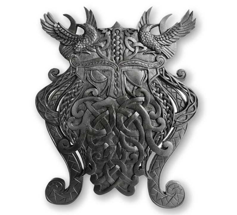 Hochwertige Handarbeit aus kleiner Familienmanufaktur. Wotansmaske mit den Raben Hugin & Munin, stilisierter Irminsul und Wikingerornamentik. Material Holz: Unterschiede in Farbe und Form und Ausdruck sind daher natürlich, ebonisiert, Größe ca.: 37 cm x 30 cm x 2 cm