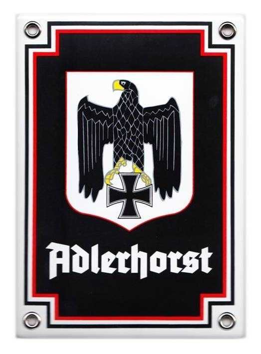 Adlerhorst Kommandeur Kehlsteinhaus. Hochwertiges Emailleschild. Das Schild kann mit 4 Schrauben angeschraubt werden. Die Schraublöcher sind mit Messingringen ausgelegt. Wetterfest, UV - beständig, leicht gewölbt, bombiert. Aufwendige handwerkliche schablonierte Ausführung. Dieses hochwertige Schild wird Ihnen viele Jahre Freude bereiten. Größe: 12 cm x 17 cm