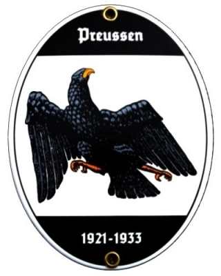 Hochwertiges Emailleschild "Preußen". Das Schild kann mit 2 Schrauben angeschraubt werden. Die Schraublöcher sind mit Messingringen ausgelegt. Wetterfest, UV - beständig, leicht gewölbt, bombiert. Aufwendige handwerkliche schablonierte Ausführung. Dieses hochwertige Schild wird Ihnen viele Jahre Freude bereiten. Größe: Oval, 15 cm hoch und 11,5 cm breit