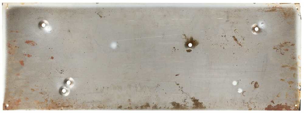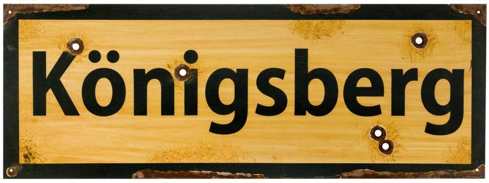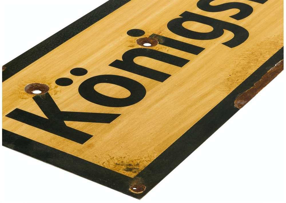 Large street sign for the frontline city of Königsberg in museum quality. High-quality reproduction made of heavy sheet steel, artificially aged with 'bullet holes' and real rust spots. 4 screw holes for mounting. Ideal for re-enactments, the hobby room at home or to complete your military collection.