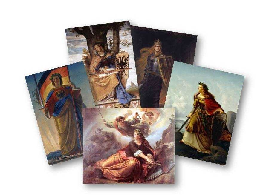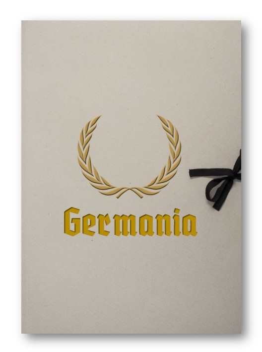 Die Germania ist seit Jahrhunderten die nationale Personifikation Deutschlands. Jeder der 5 Kunstdrucke im Format 29,7 x 42 cm (DIN A3), veredelte Sammelmappe 43,7 cm x 31,4 cm, mit goldfarbenen Applikationen (Schriftzug Germania mit Lorbeerkranz) und Verschlussbändchen.