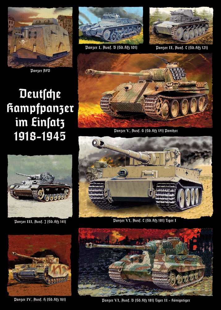 Dieses Plakat zeichnet die technische Entwicklung der deutschen Kampfpanzer nach. Von den zunächst Tanks genannten trägen Ungetümen aus Stahl und Ketten wie dem legendären, 30 Tonnen schweren A7V mit 16 Mann Besatzung, über die schnellen, leichten Panzerfahrzeuge I und II sowie die Standardkampfwagen der Blitzkriege Panzer III und IV, kulminierte die Entwicklung in den starken, beim Feind gefürchteten Panzer V Panther" sowie den Panzern VI Tiger" I und Tiger" II (Königstiger"). 50 x 70 cm , wird gerollt in einer sehr stabilen Posterrolle geliefert.